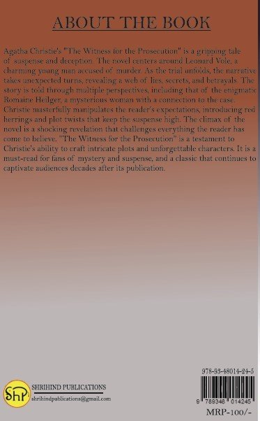 Agatha Christie’s “The Witness for the Prosecution” is a gripping o of suspense and deception. The novel centers around Leonard Volr, a charming young man accused of murder. As the trial unfolds, the darvative takes unexpected turns, revealing a web of lies, secrets, and betrayals. The story is told through multiple perspectives, including that of the enigmatic Romaine Heilger, a mysterious woman with a connection to the cale Christie masterfully manipulates the reader’s expectations, introducing ted herrings and plot twists that keep the suspense high. The climax of the novel is a shocking revelation that challenges everything the reader has come to believe. “The Witness for the Prosecution” is a testament to Christie’s ability to craft intricate plots and unforgettable characters. It is a must-read for fans of mystery and suspense, and a classic that continues to captivate audiences decades after its publication.